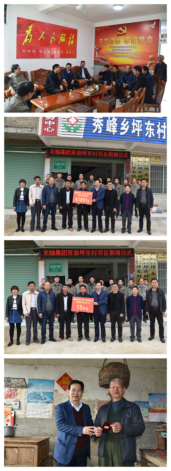 隨后,在村部舉行龍軸集團(tuán)資助坪東村項(xiàng)目捐贈(zèng)儀式,村支書代表村兩委接受了公司資助坪東村建設(shè)村部文化廣場的15萬元和公司全體員工募捐的善款41891元。曾凡沛鄭重要求要善用善款,切實(shí)建設(shè)好村部文化廣場,讓村里有個(gè)好的宣傳環(huán)境,讓村民活動(dòng)有個(gè)好去處,豐富農(nóng)村精神文化生活。
