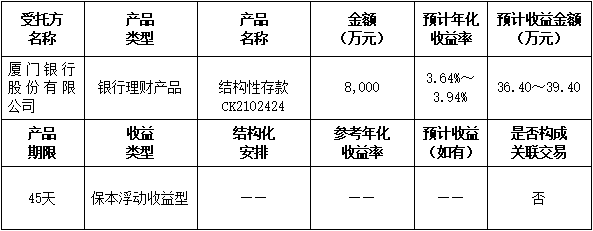 ?本次委托理財(cái)金額:委托廈門銀行理財(cái)8,000萬元。