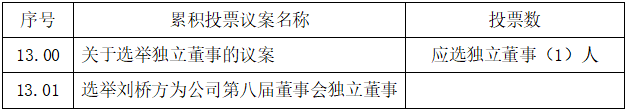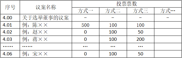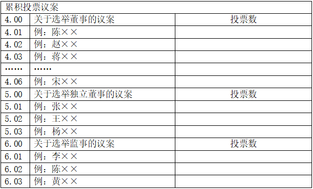 某投資者在股權登記日收盤時持有該公司100股股票,采用累積投票制,他(她)在議案4.00“關于選舉董事的議案”就有500票的表決權,在議案5.00“關于選舉獨立董事的議案”有200票的表決權,在議案6.00“關于選舉監(jiān)事的議案”有200票的表決權。