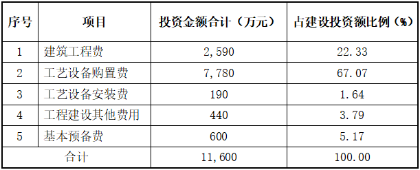 項目總投資15,500萬元,其中:建筑工程費2,590萬元,工藝設(shè)備購置費7,780萬元,工藝設(shè)備安裝費190萬元,工程建設(shè)其他費用440萬元,基本預(yù)備費600萬元,鋪底流動資金3,900萬元。