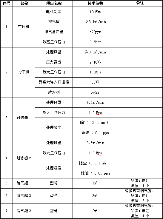 項(xiàng)目名稱:購(gòu)置1套空壓機(jī)系統(tǒng)(約18.5kw,含配套冷干機(jī)、1m³氣罐、過(guò)濾器)