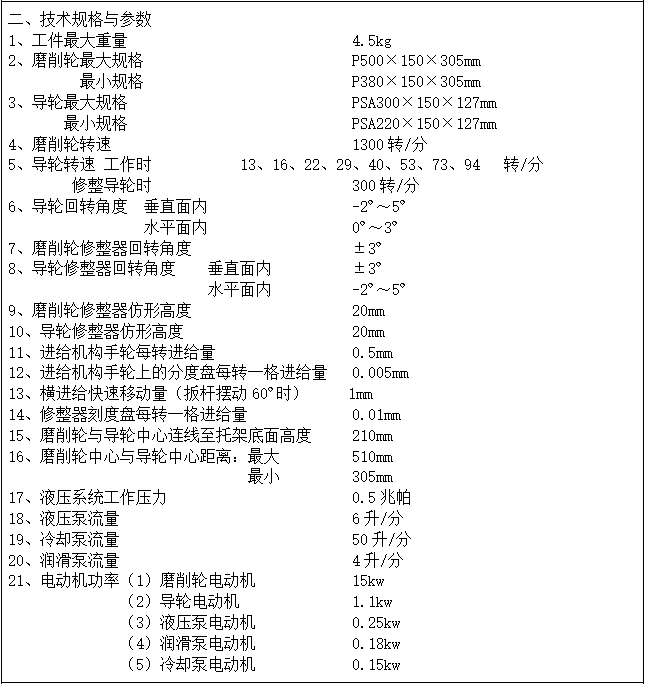 設備驗收時,根據實際生產情況,雙方協(xié)商選用其它產品型號作為驗收型號,以產品磨削精度來驗證設備加工精度,及對“主要技術參數”中的內容進行驗收
