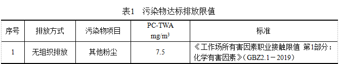 砂帶機產(chǎn)生的粉塵經(jīng)處理后達到《大氣污染物排放標(biāo)準(zhǔn)》(GB16297-1996)表2二級標(biāo)準(zhǔn)要求,即顆粒物排放濃度≤120mg/m3,尾氣接至窗戶外,同時增加百葉窗裝飾。同時,車間內(nèi)無組織排放粉塵能符合《工作場所有害因素職業(yè)接觸限值 第1部分:化學(xué)有害因素》(GBZ2.1-2019)相應(yīng)標(biāo)準(zhǔn)要求,具體見下表1。