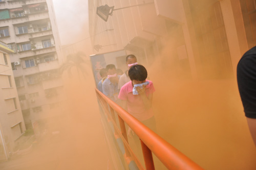 在闕教官講解相關(guān)消防知識和消防器材使用方法、傳授消防逃生應(yīng)變技能和自我保護技能及明確各演練職能小組職責(zé)和演練小組疏散路線之后,演練開始。滅火行動組在得到演練命令后,立即發(fā)出火警訊號,并在各指定點放啟煙霧彈,樓梯道和走廊瞬間頓時濃煙滾滾。各演練組聽到逃生訊號后,在應(yīng)急疏散隊的組織下,按組分批迅速有序地從俱樂部二樓往一樓籃球場疏散撤離,每人用濕毛巾捂住嘴巴,彎腰匍匐前進,按規(guī)定的順序疏散,直到?jīng)_出煙區(qū)。