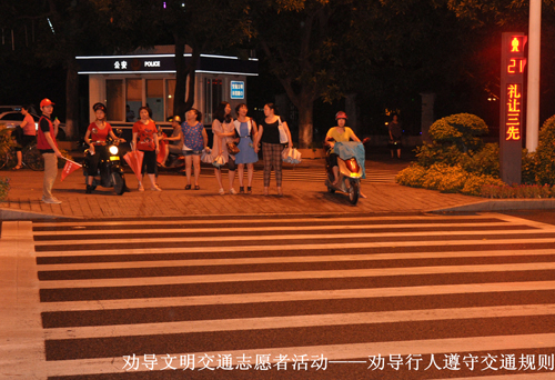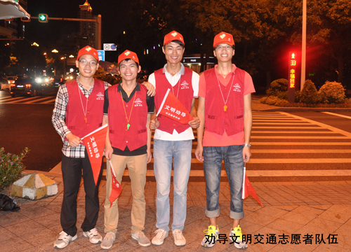 活動當晚,適逢臺風天氣影響,下起了臺風雨,但這絲毫不影響我司志愿者們的服務(wù)熱情,他們統(tǒng)一身著志愿服務(wù)紅馬褂、帽子,持宣傳小旗、口哨,早早地走上街頭,對闖紅燈和橫穿馬路的行人進行耐心、禮貌的勸導(dǎo),制止亂扔垃圾等不文明行為的發(fā)生,讓行人自覺規(guī)范行為,樹立較強的交通安全意識和文明風尚意識。