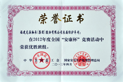 | 國家級 | 2013年 | 全國“安康杯”競賽優(yōu)勝班組(表面防護車間) | 中國總工會,國家安全生產(chǎn)監(jiān)督管理總局 |