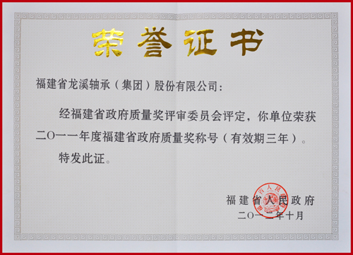 2012年10月19日上午,第三屆福建省政府質(zhì)量獎(jiǎng)?lì)C獎(jiǎng)大會(huì)在莆田召開(kāi),福建龍溪軸承(集團(tuán))股份有限公司被福建省人民政府授予“2011年度福建省政府質(zhì)量獎(jiǎng)”,成為漳州市首家榮獲此獎(jiǎng)項(xiàng)的企業(yè)。福建省質(zhì)量技術(shù)監(jiān)督局局長(zhǎng)黃維禮、莆田市人民政府市長(zhǎng)梁建勇等領(lǐng)導(dǎo)出席大會(huì)并為獲獎(jiǎng)單位頒獎(jiǎng),福建龍溪軸承(集團(tuán))股份有限公司黨委書(shū)記、董事長(zhǎng)曾凡沛出席大會(huì)并接受獎(jiǎng)杯、獎(jiǎng)金。
